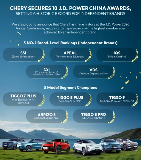 Pada tanggal 19 Maret, di Konferensi Tahunan dan Upacara Penghargaan J.D. Power 2026, Chery Group—didorong oleh kualitas produk yang luar biasa dan sistem layanan rantai nilai penuh—mendapatkan 5 peringkat pertama di tingkat merek ditambah 7 kejuaraan tingkat model dan 2 penghargaan teladan, dengan total 14 penghargaan utama. Hal ini tidak hanya menyegarkan kinerja merek-merek independen secara keseluruhan dalam sistem evaluasi otoritatif ini, namun juga menetapkan satu-satunya catatan sejarah merek independen yang menjadi “Juara Lima Kali” J.D. Power, menandai lompatan sistematis dari kekuatan yang terisolasi menjadi kepemimpinan di seluruh sistem di bawah bendera “Quality Chery”.